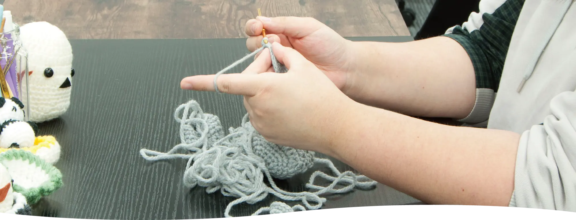 クラフト作業では、猫ちぐら制作から編みぐるみ、羊毛フェルト、クロスステッチの小物制作に幅広い生産活動とともにバザーでの販売を目的とした作品作りを目指しています。